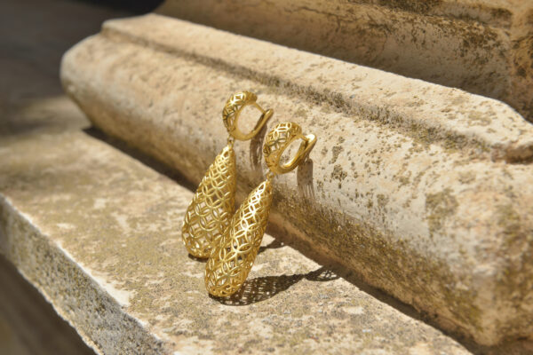 Por último, la colección Electra aporta una lectura más contemporánea y geométrica. Sus formas inspiradas en estructuras intrincadas convierten cada pieza en un elemento que dialoga con los cortes de sastrería y las líneas definidas de algunos de los looks de Crush. Electra aporta presencia y modernidad sin restar la suavidad del conjunto general.