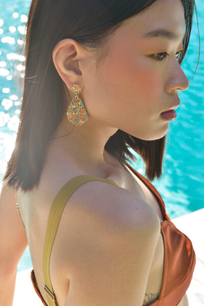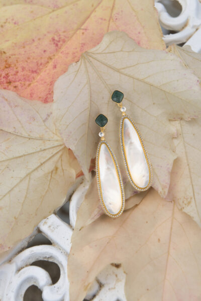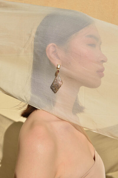 Los pendientes de plata con madreperla tallada en delicadas filigranas de Palmyra, ofrecen una estética que conversa con la artesanía y el movimiento de Crush. El nácar, con sus reflejos irisados y su tacto orgánico, actúa como un puente entre lo natural y lo sofisticado, subrayando la elegancia sin estridencias y el impulso artesanal que caracteriza a ambas marcas.