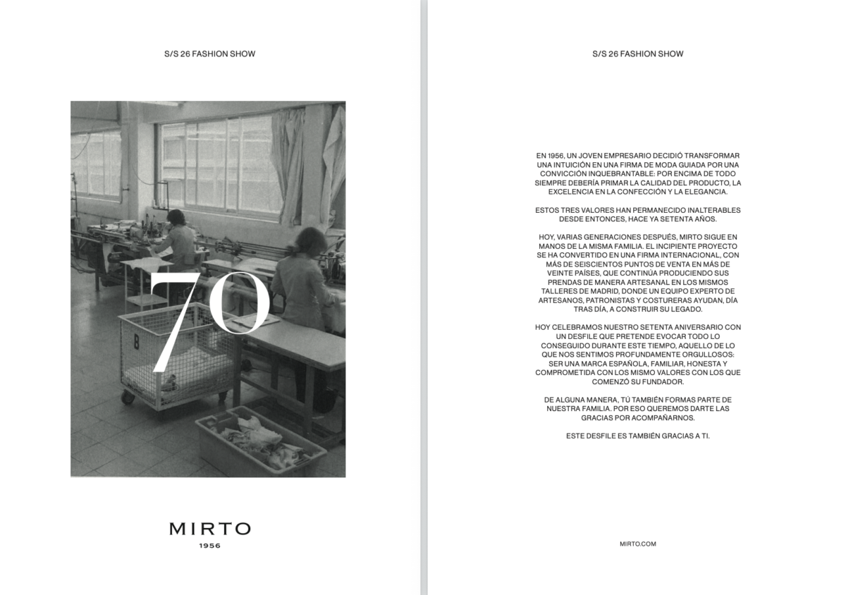El desfile del 70 aniversario de MIRTO no solo celebra una trayectoria de siete décadas, sino también el diálogo entre historia y contemporaneidad, entre tradición y modernidad, con Salvatore Plata como compañero perfecto en esta historia.