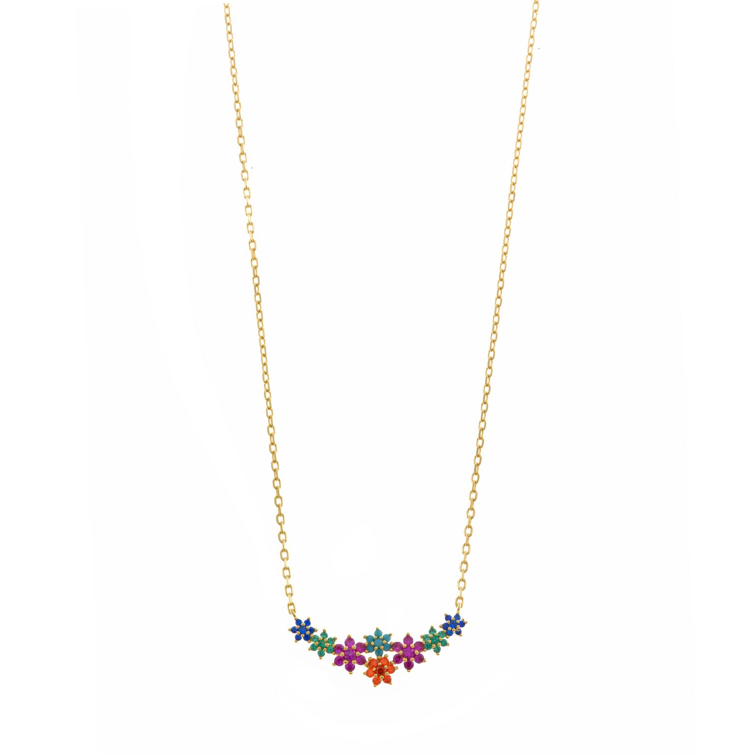 On the other hand, necklaces with floral or geometric compositions also stand out , where small colored zircons are harmoniously arranged to create shapes full of detail and freshness. These jewels also belong to the VIBRANT collection.