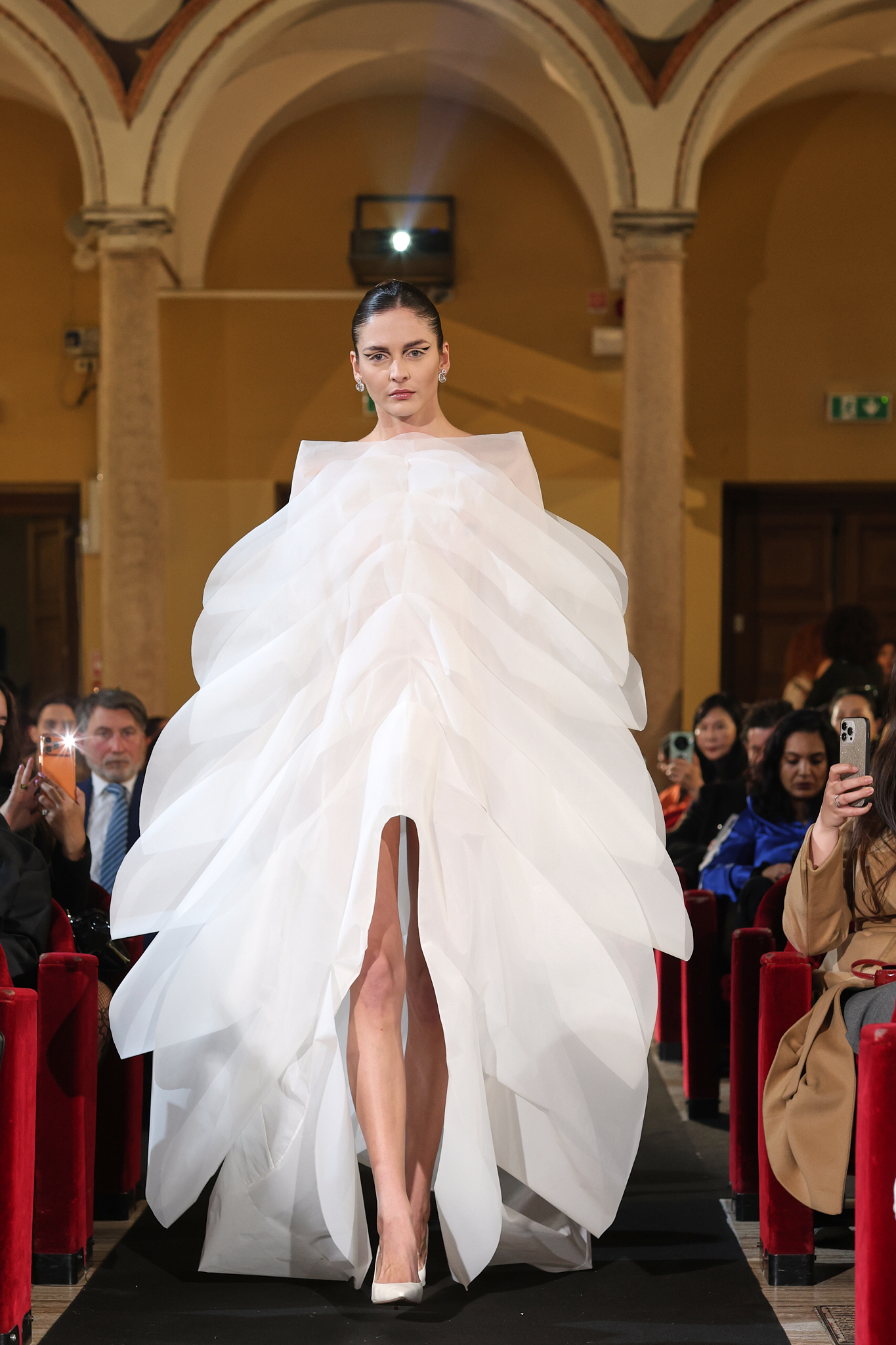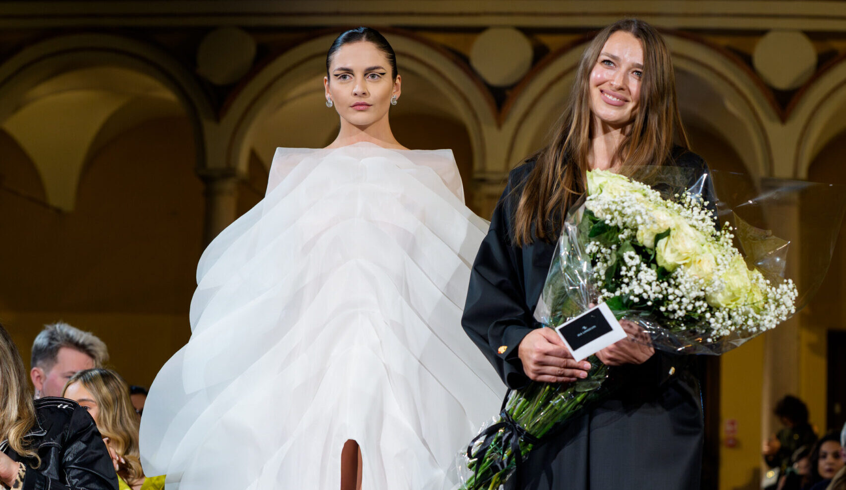 In Milan, where fashion history constantly meets innovation, this encounter between architecture, fabric and jewelry created one of the most memorable moments of the season.