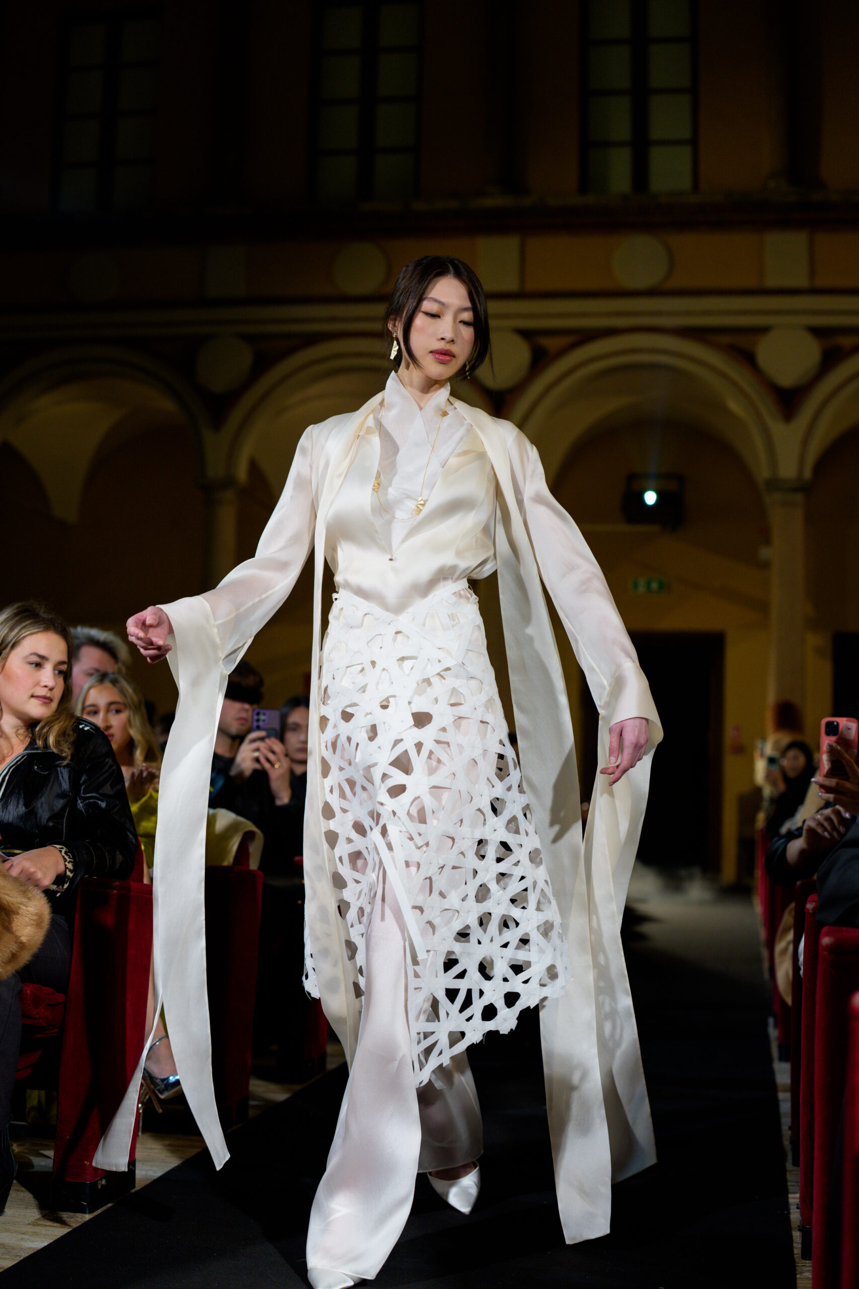 Strategic sparkle, precise volumes and thoughtful styling allowed Silken Code to integrate seamlessly into ORIGAMI’s conceptual world. Rather than dominating the looks, the jewelry acted as a refined extension of the garments — enhancing lines, emphasizing movement and reinforcing the dialogue between tradition and modernity.
