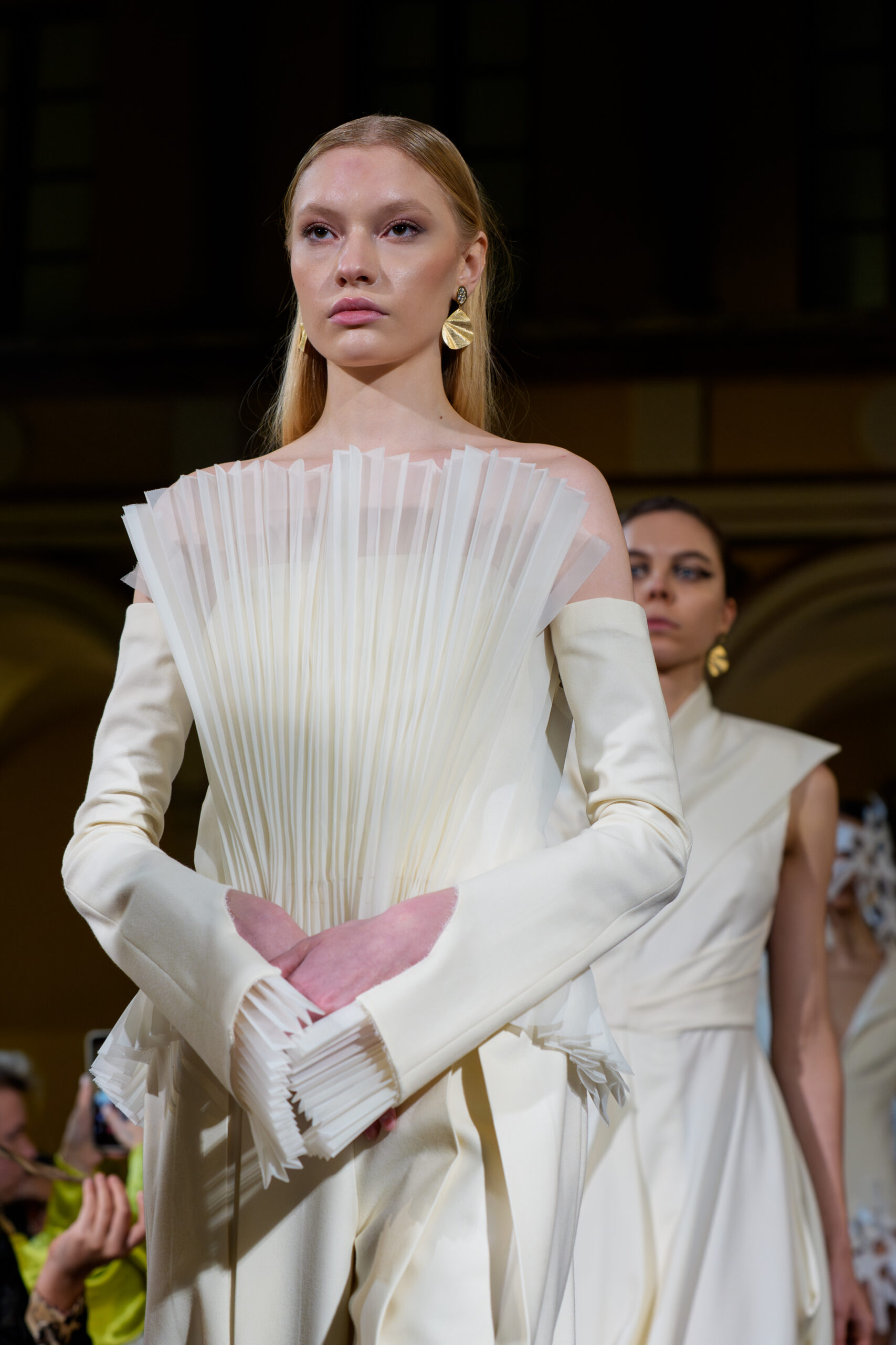 Large yet ultralight earrings and rhythmic shapes give Bamboo its distinctive character — jewelry that moves effortlessly with the wearer while maintaining strong visual identity. On the runway, these pieces echoed the architectural folds of Langevin’s garments, reinforcing the sense of structured elegance.