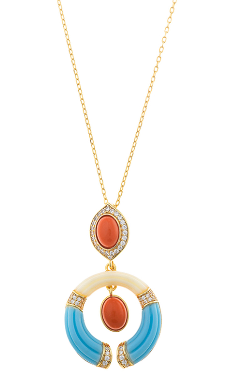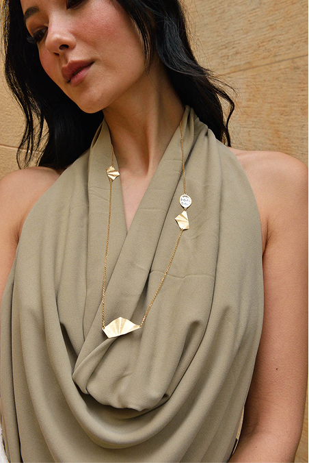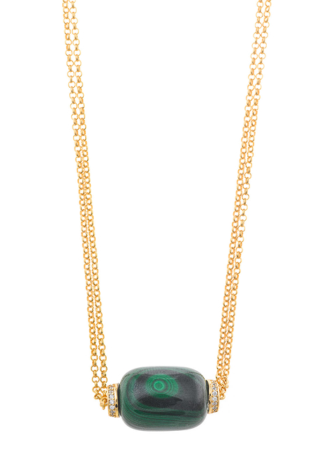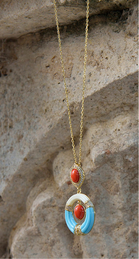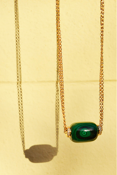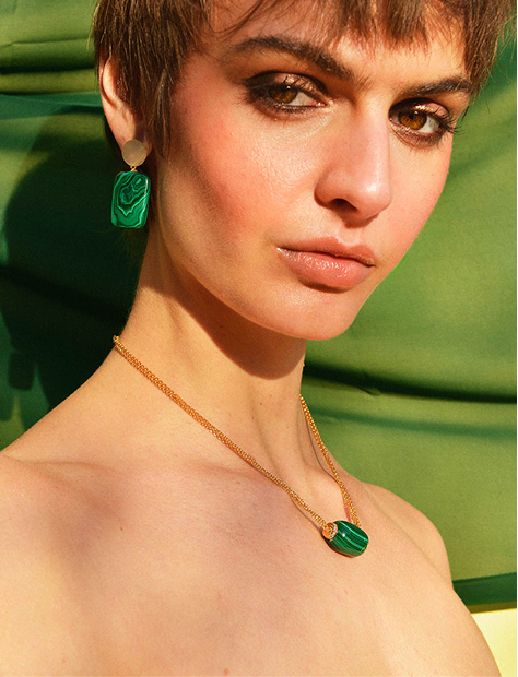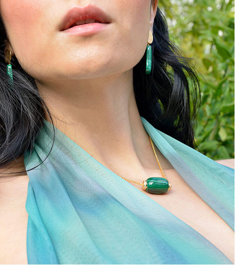 The Petra collection necklace is a bold gold-plated maxi piece with vibrant resins and enamels, adding presence and a summery touch, perfect for those seeking jewelry with personality and daring style. Meanwhile, the Palmyra necklace with natural malachite blends artisanal tradition with contemporary style, ideal for a sophisticated and refined look.