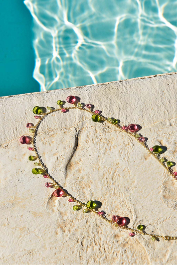 Héritière necklaces celebrate delicacy with freshwater pearls and natural stones such as malachite, lapis lazuli and moonstone, in designs that combine color and subtle elegance.