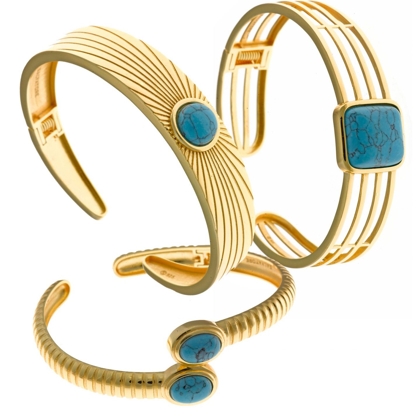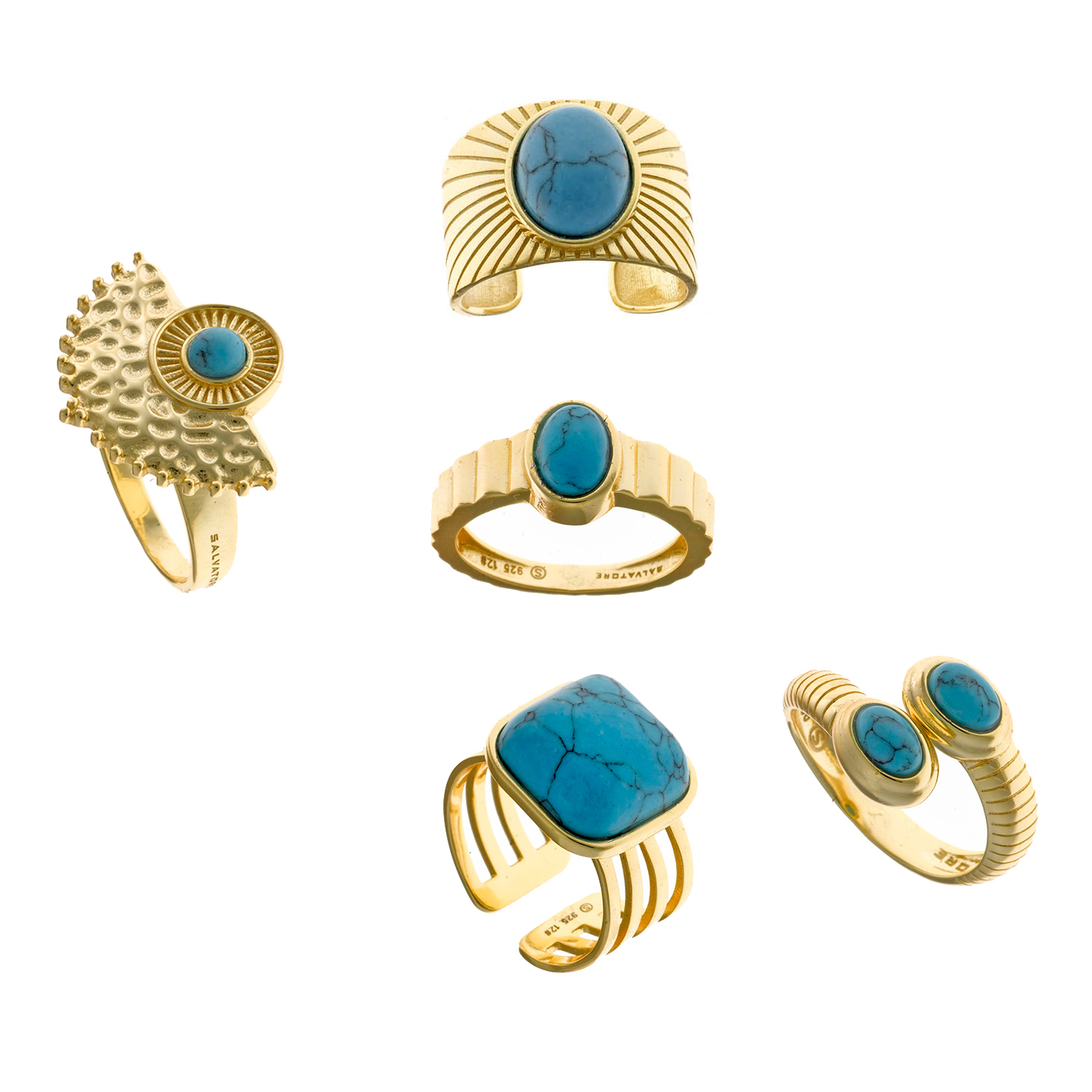 The Marmara collection is comprised of matching earrings, rings, bracelets, and pendants, all crafted in gold-plated sterling silver. Each piece is adorned with hydrothermal stones in shades of turquoise that evoke the serenity and splendor of the sea. This combination not only brings elegance and sophistication but also pairs beautifully with tanned skin, making it the perfect choice for summer.