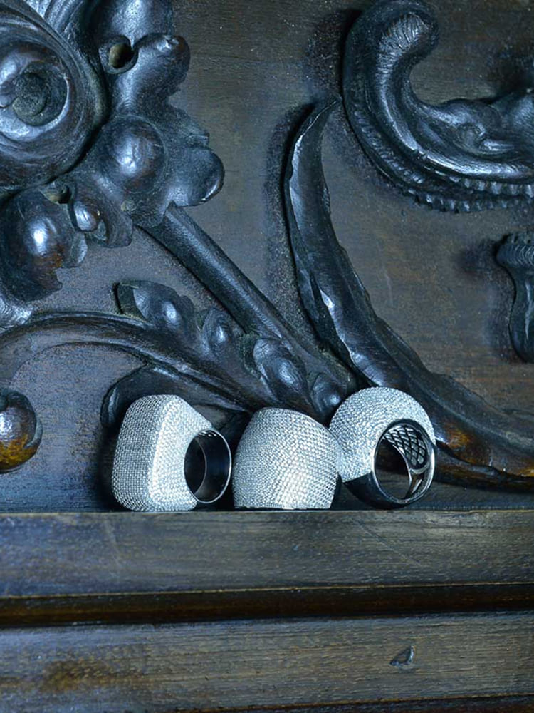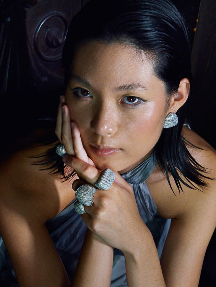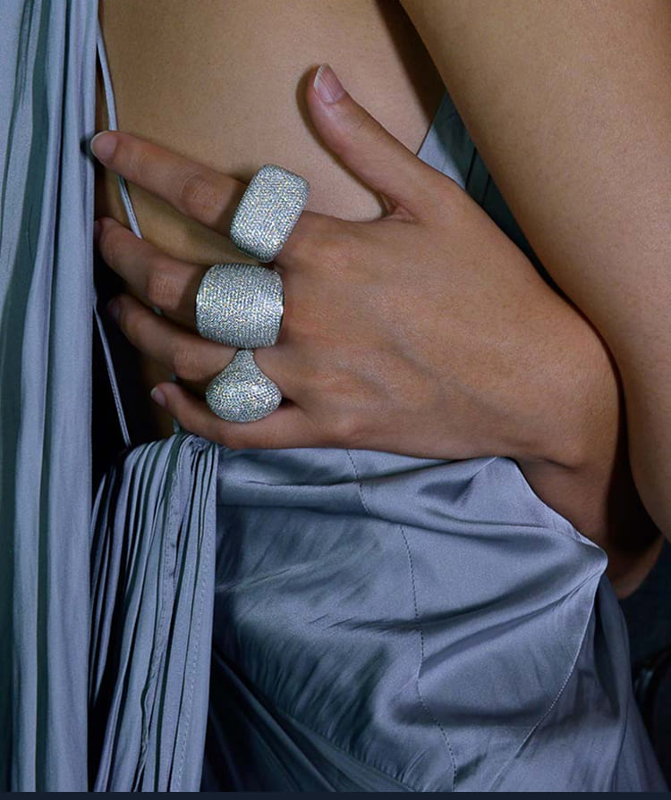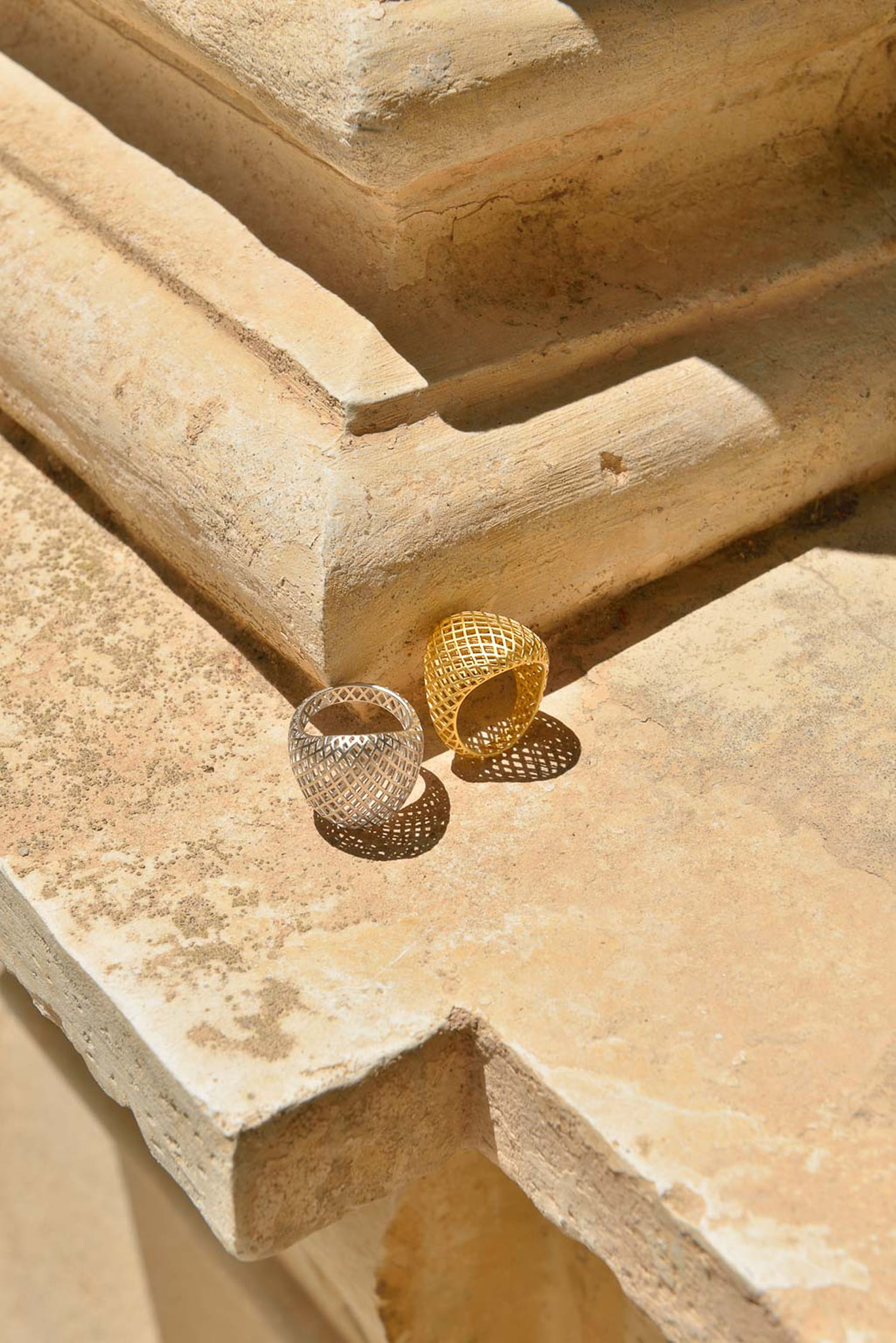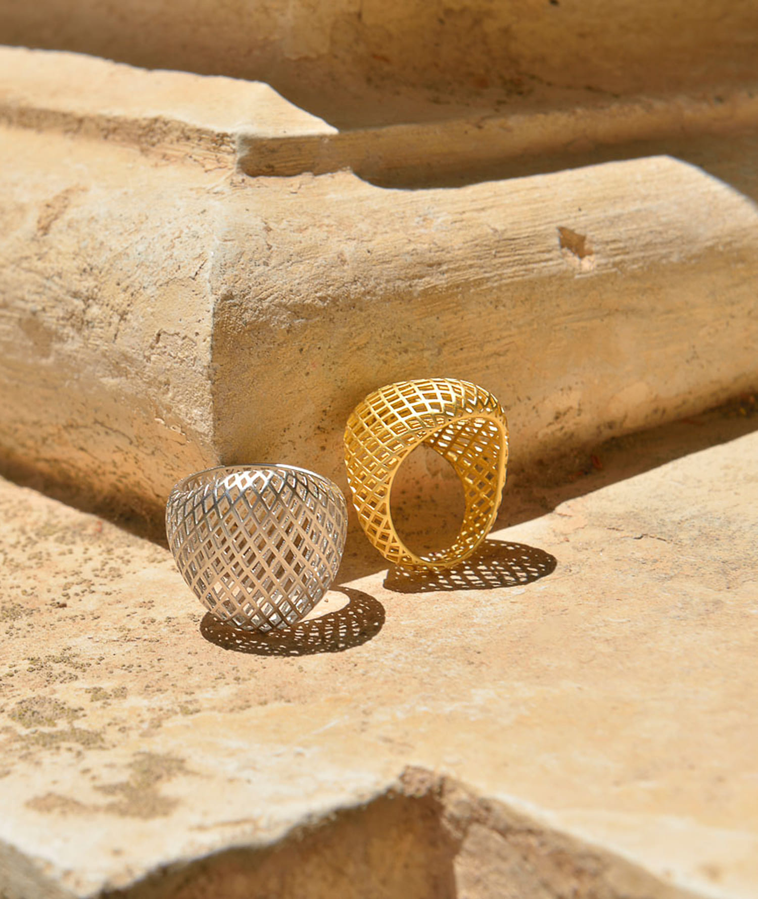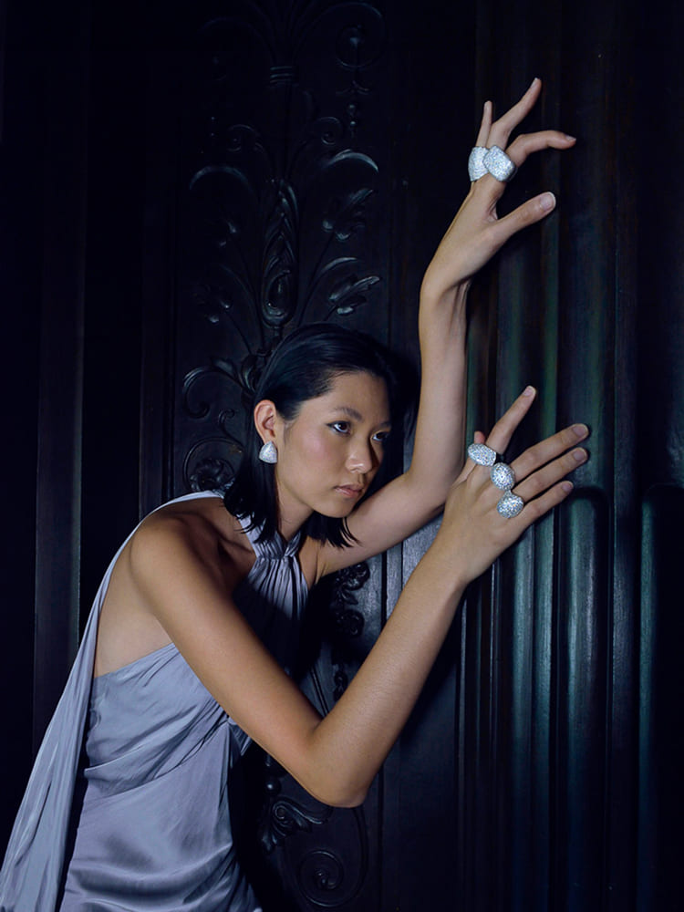 Gli anelli Rouge sono pura intensità: maxi design in argento placcato oro con zirconi color rubino, evocando la forza e il magnetismo delle gemme birmane. In Silken Code, gli anelli giocano con il movimento e la luce grazie alla montatura ispirata ai telai di Suzhou, cosparsa di zirconi di diverse misure che creano un effetto ipnotico. Due modi di vestire le mani con brillantezza e personalità.