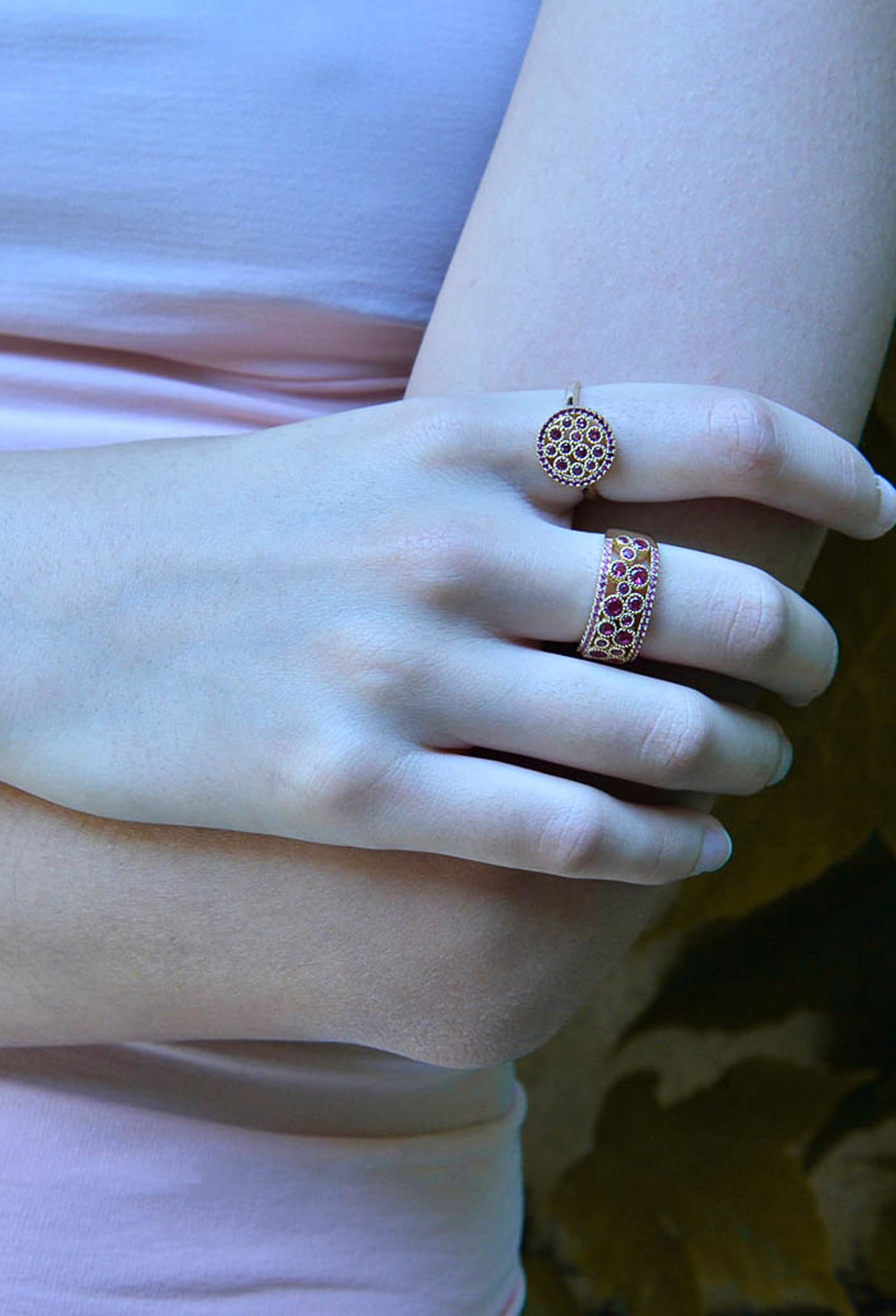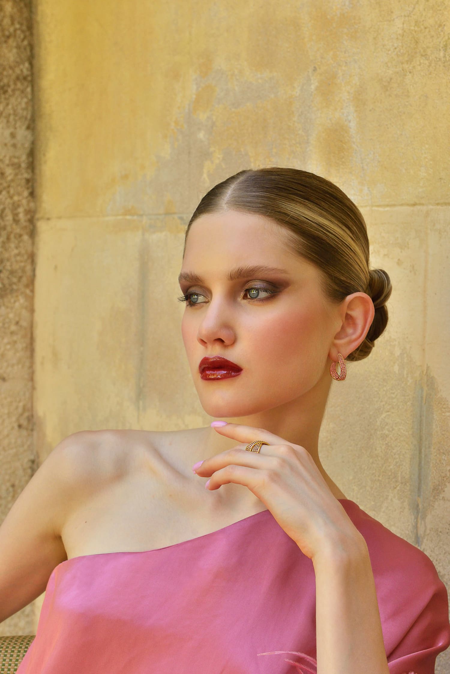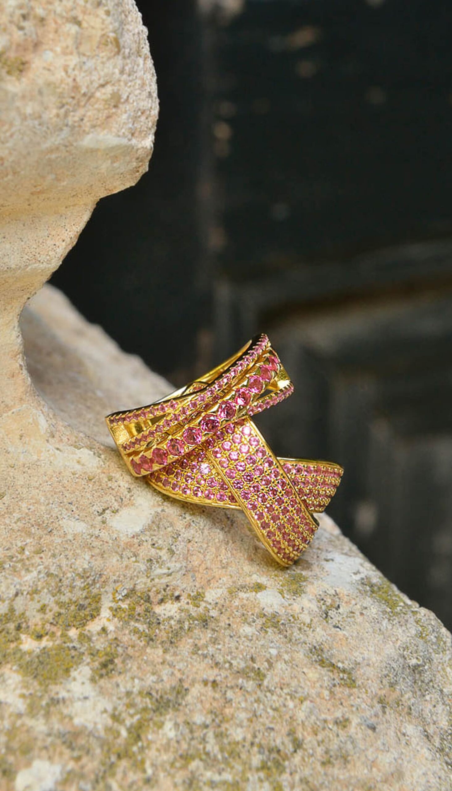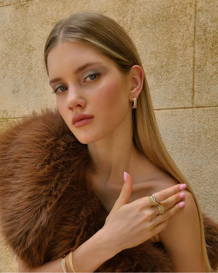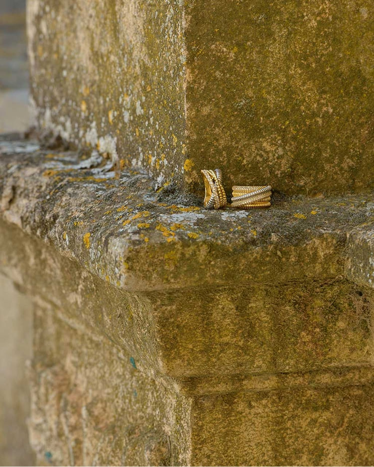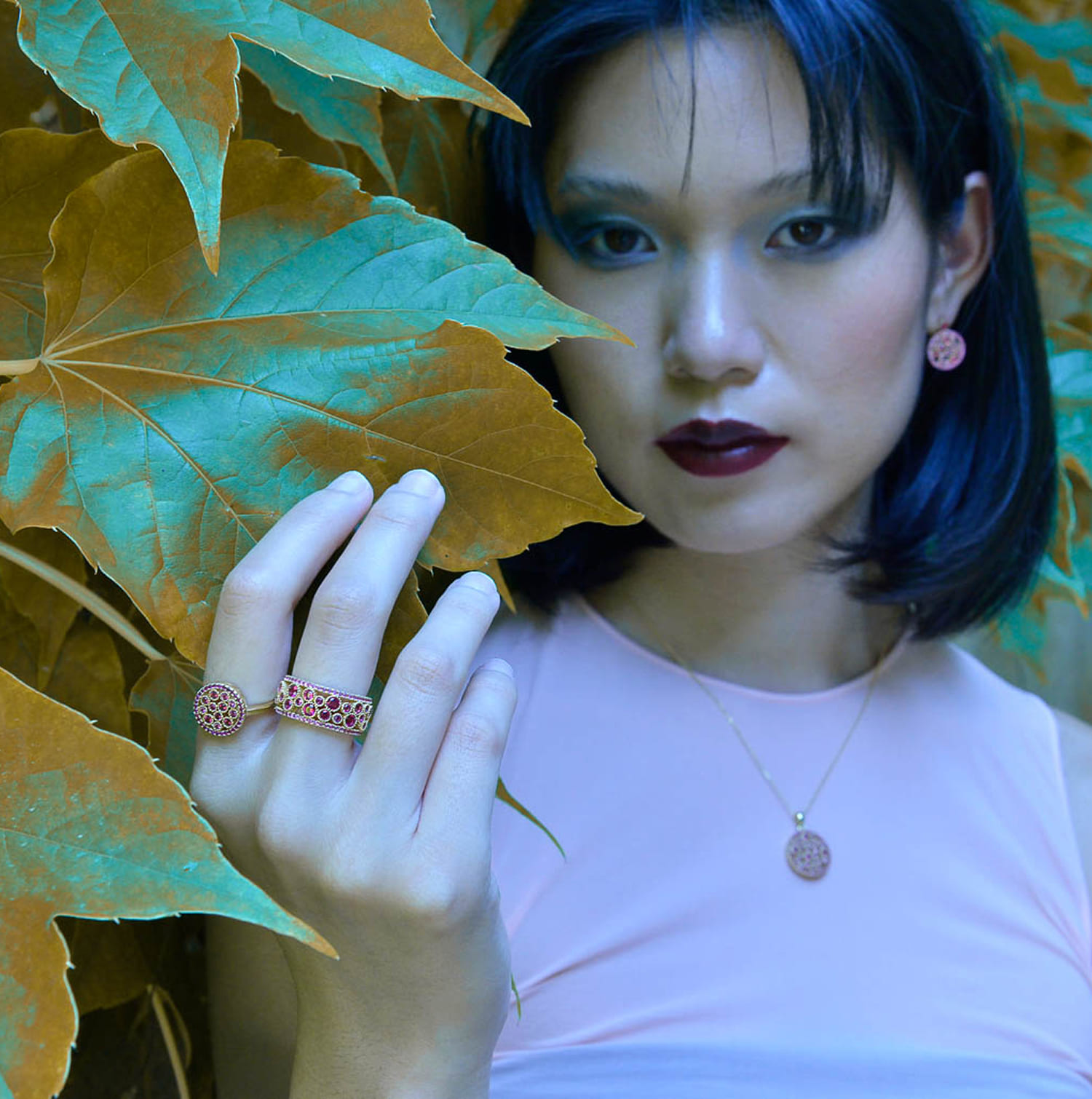 Gli anelli Rouge sono pura intensità: maxi design in argento placcato oro con zirconi color rubino, evocando la forza e il magnetismo delle gemme birmane. In Silken Code, gli anelli giocano con il movimento e la luce grazie alla montatura ispirata ai telai di Suzhou, cosparsa di zirconi di diverse misure che creano un effetto ipnotico. Due modi di vestire le mani con brillantezza e personalità.