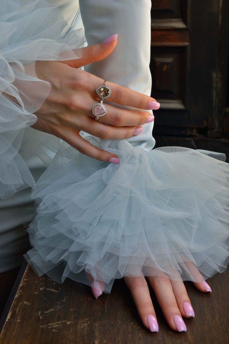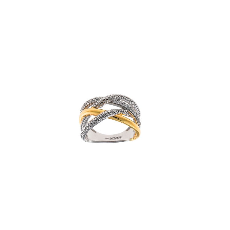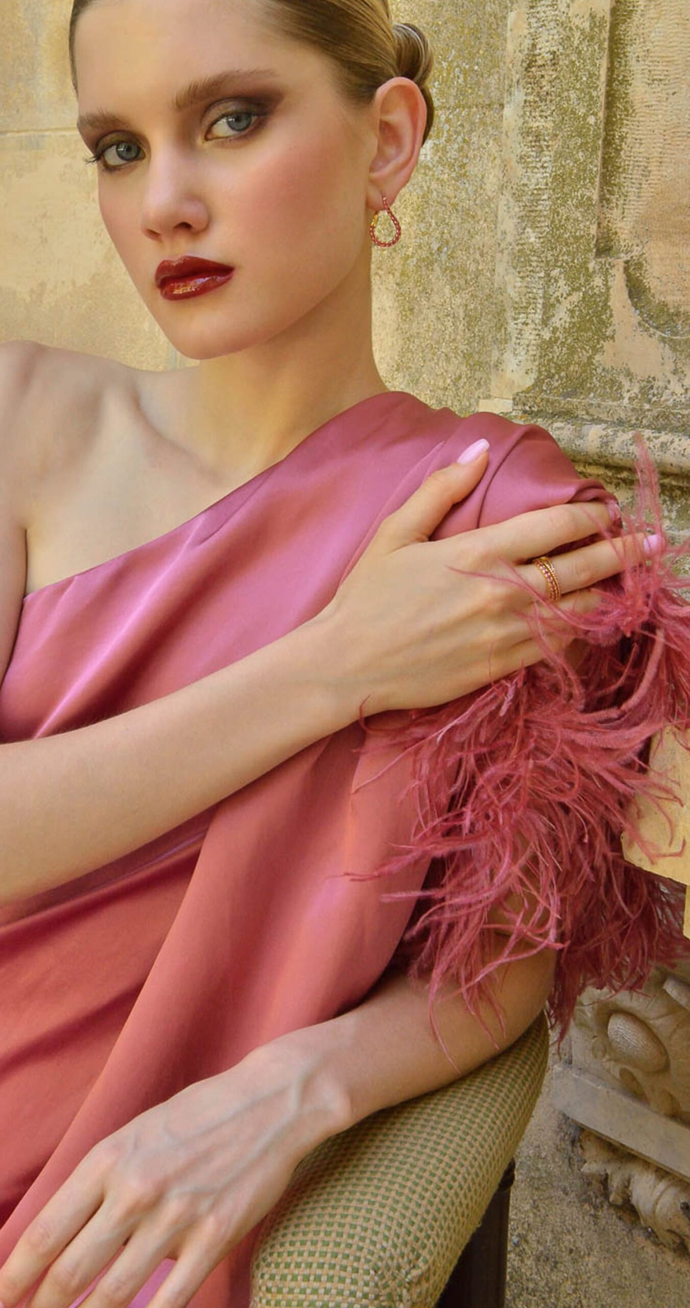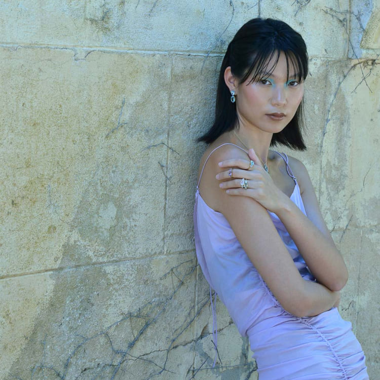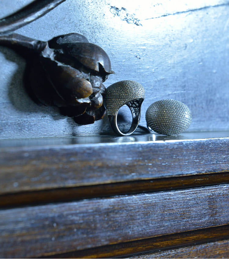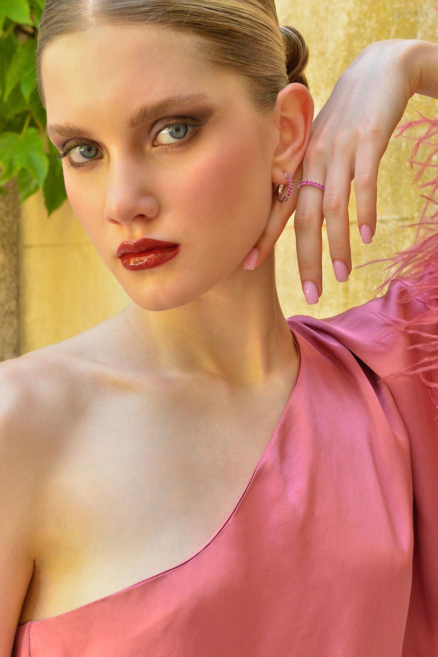 Gli anelli Rouge sono pura intensità: maxi design in argento placcato oro con zirconi color rubino, evocando la forza e il magnetismo delle gemme birmane. In Silken Code, gli anelli giocano con il movimento e la luce grazie alla montatura ispirata ai telai di Suzhou, cosparsa di zirconi di diverse misure che creano un effetto ipnotico. Due modi di vestire le mani con brillantezza e personalità.