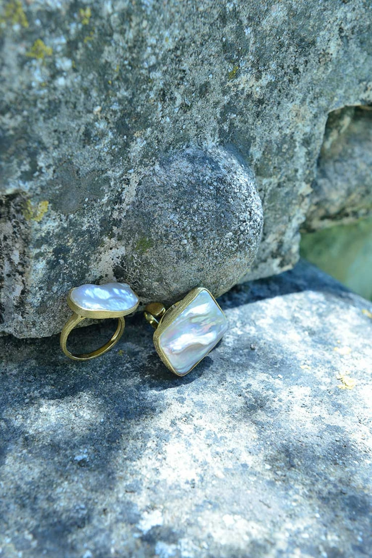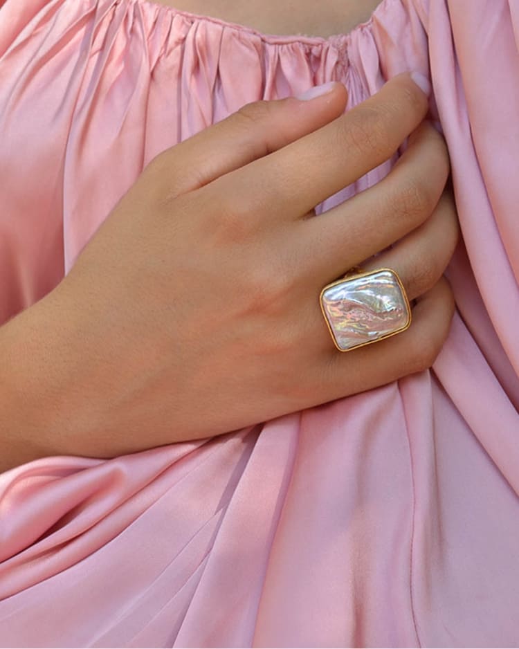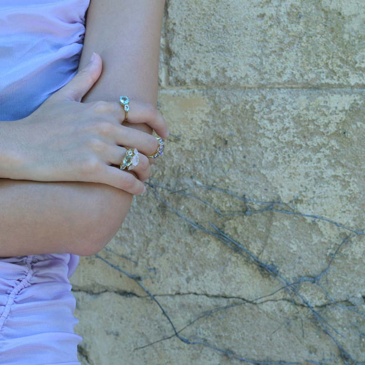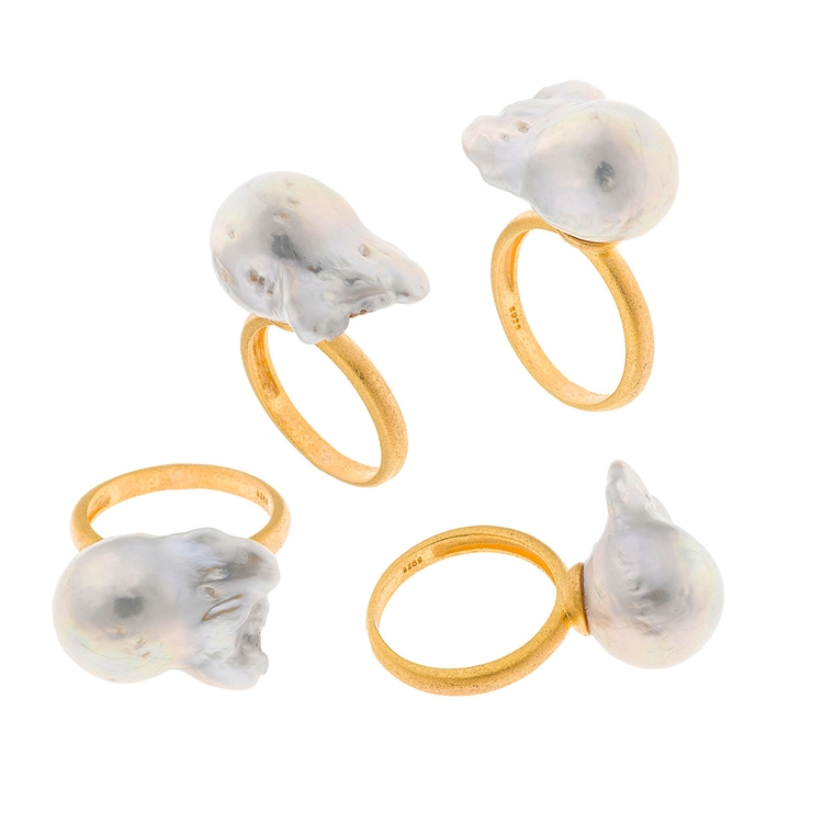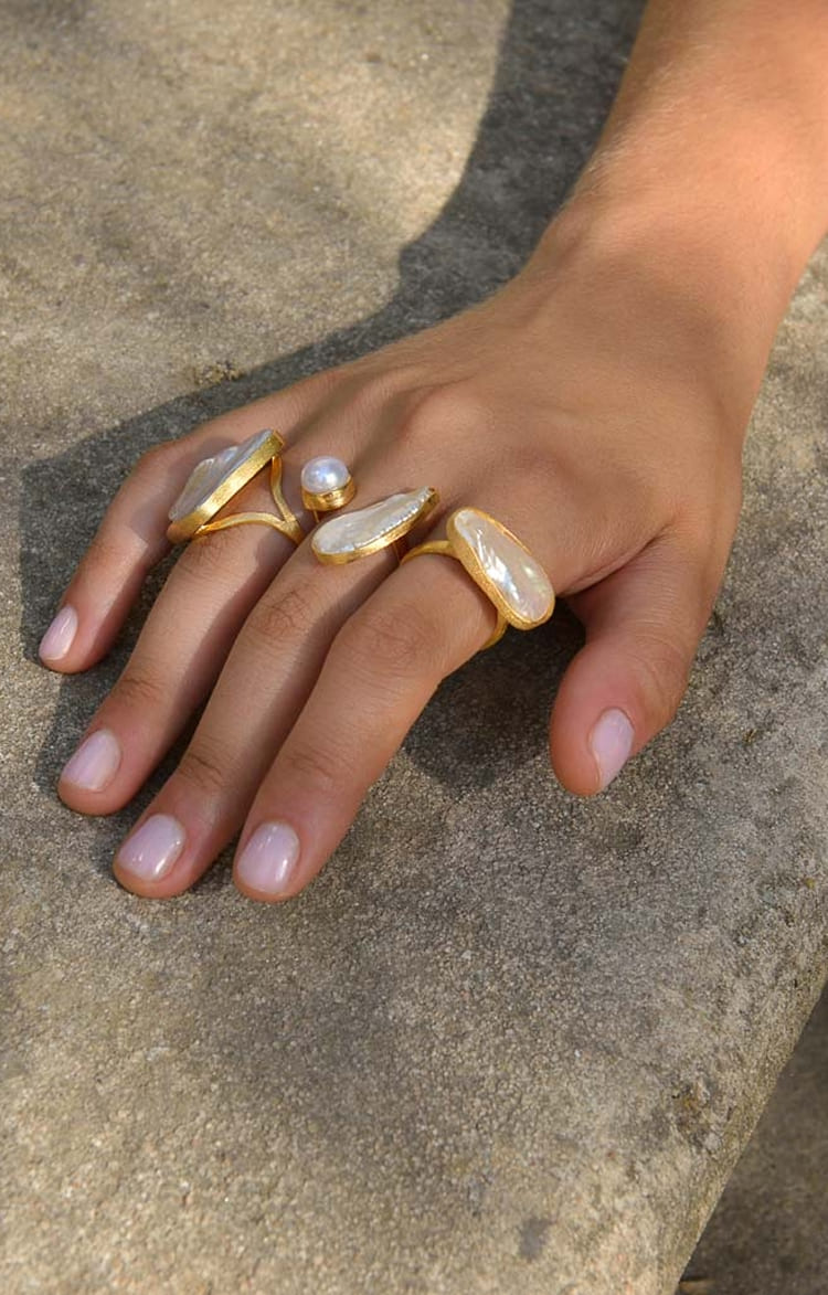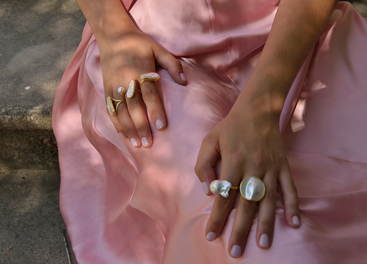 In Helenica, la perla barocca è la grande protagonista, abbracciata da montature uniche che trasformano ogni anello in un pezzo di carattere e viaggio. In Life in Gold, la madreperla e gli zirconi bianchi si combinano in design delicati con finitura setosa, perfetti per l’uso quotidiano.