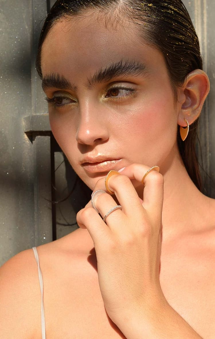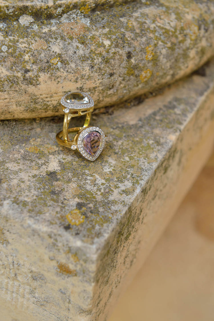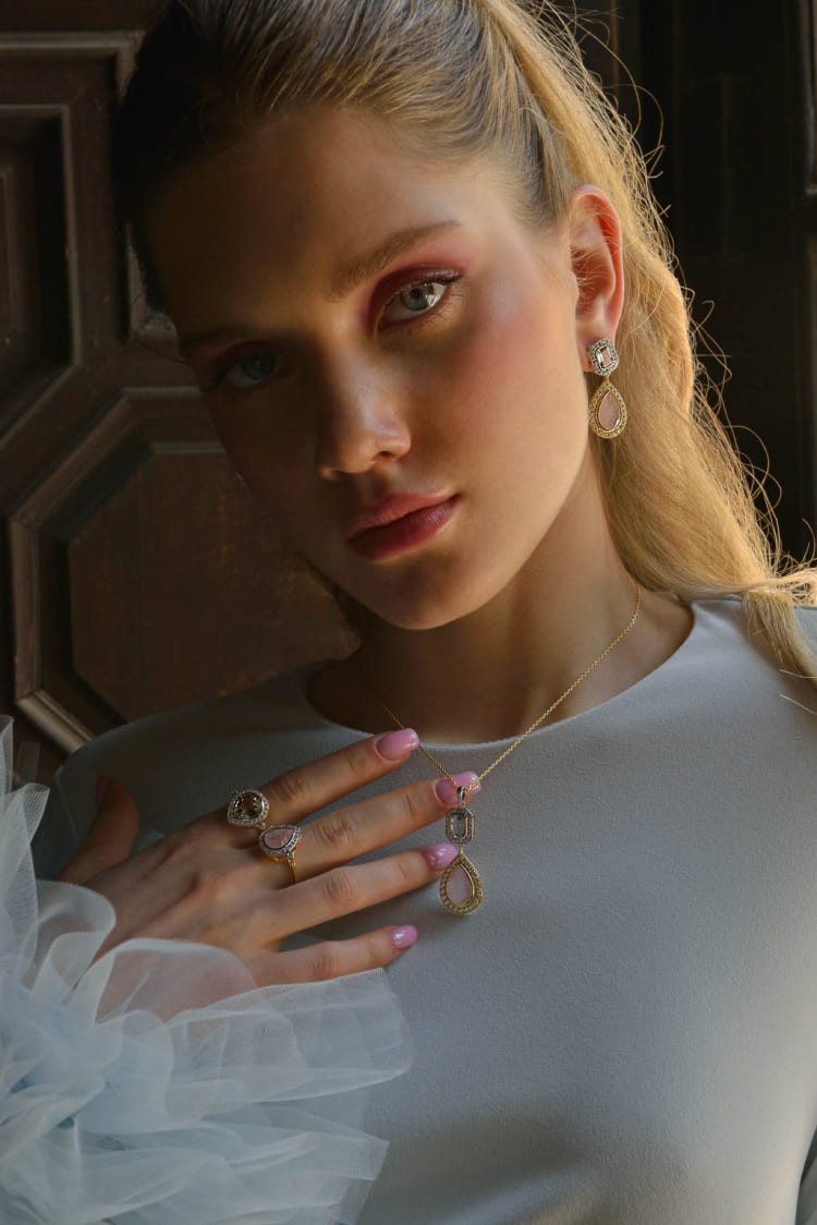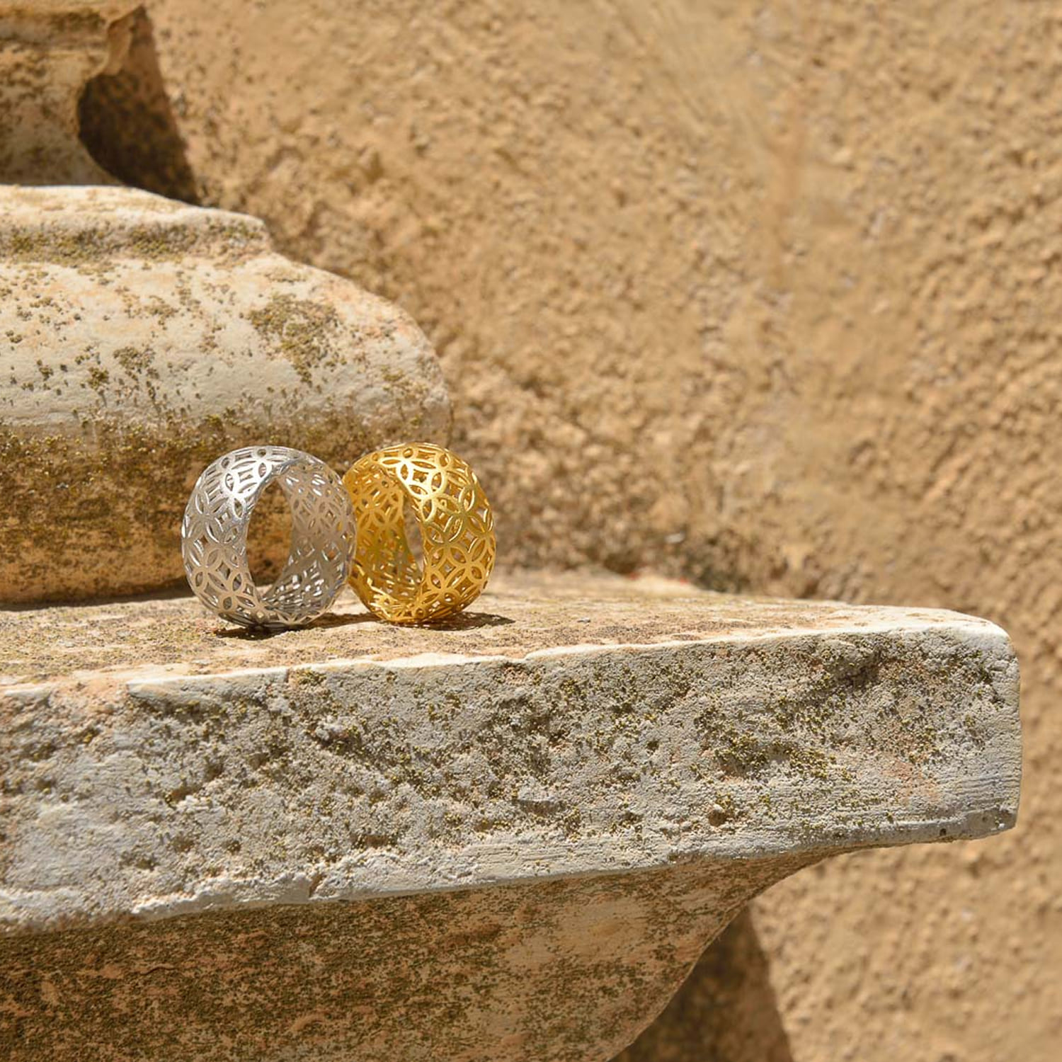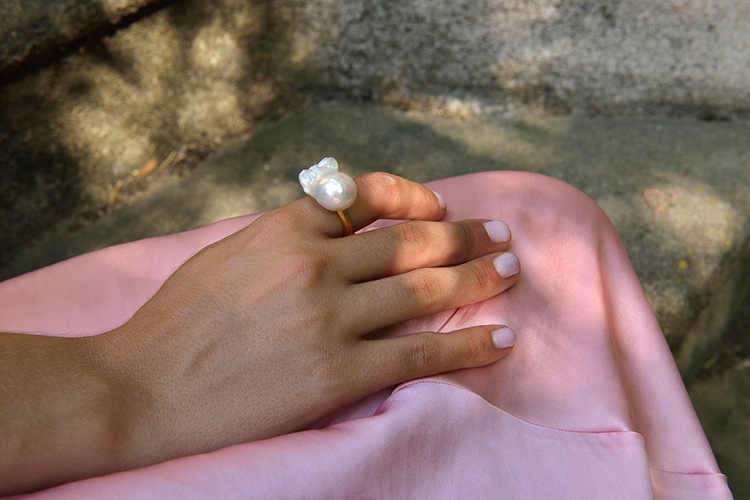In Helenica, la perla barocca è la grande protagonista, abbracciata da montature uniche che trasformano ogni anello in un pezzo di carattere e viaggio. In Life in Gold, la madreperla e gli zirconi bianchi si combinano in design delicati con finitura setosa, perfetti per l’uso quotidiano.