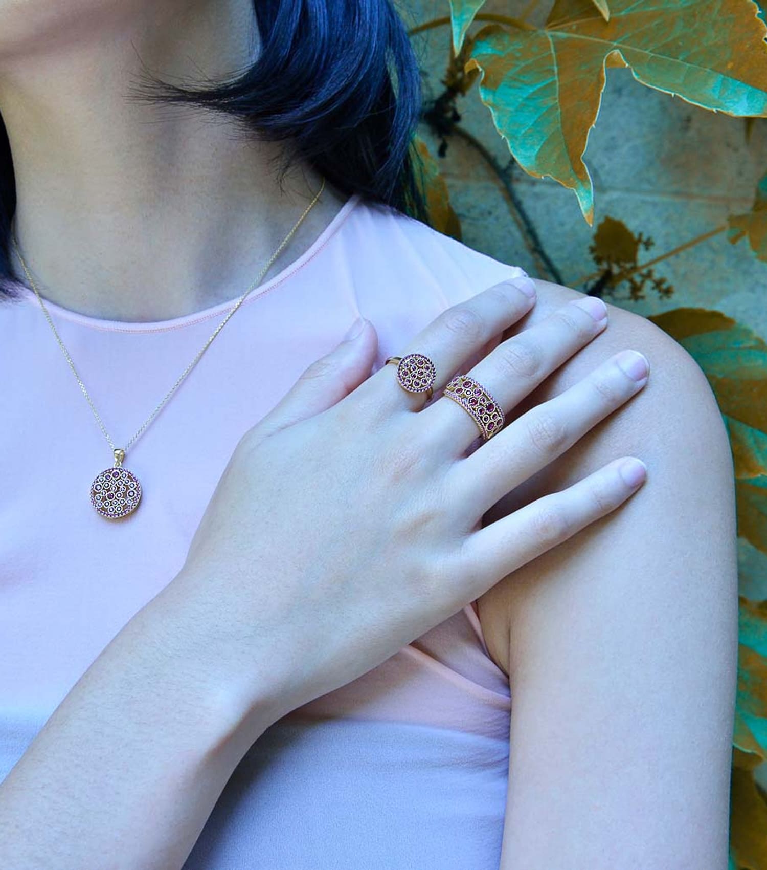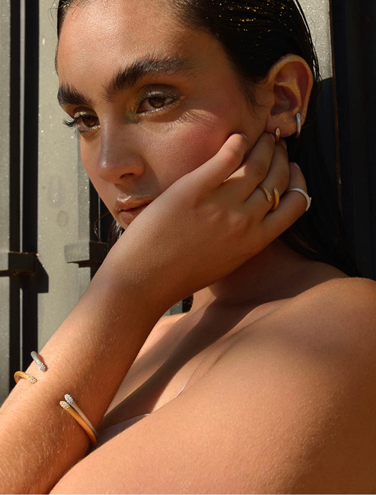 Astral celebra la luce delle stelle in gioielli che combinano storia ed eleganza. Le sue collane, anelli e bracciali si distinguono per cerchi intrecciati in oro e rodio, illuminati dal bagliore puro degli zirconi bianchi, creando pezzi che irradiamo forza e sofisticata atemporalità.
