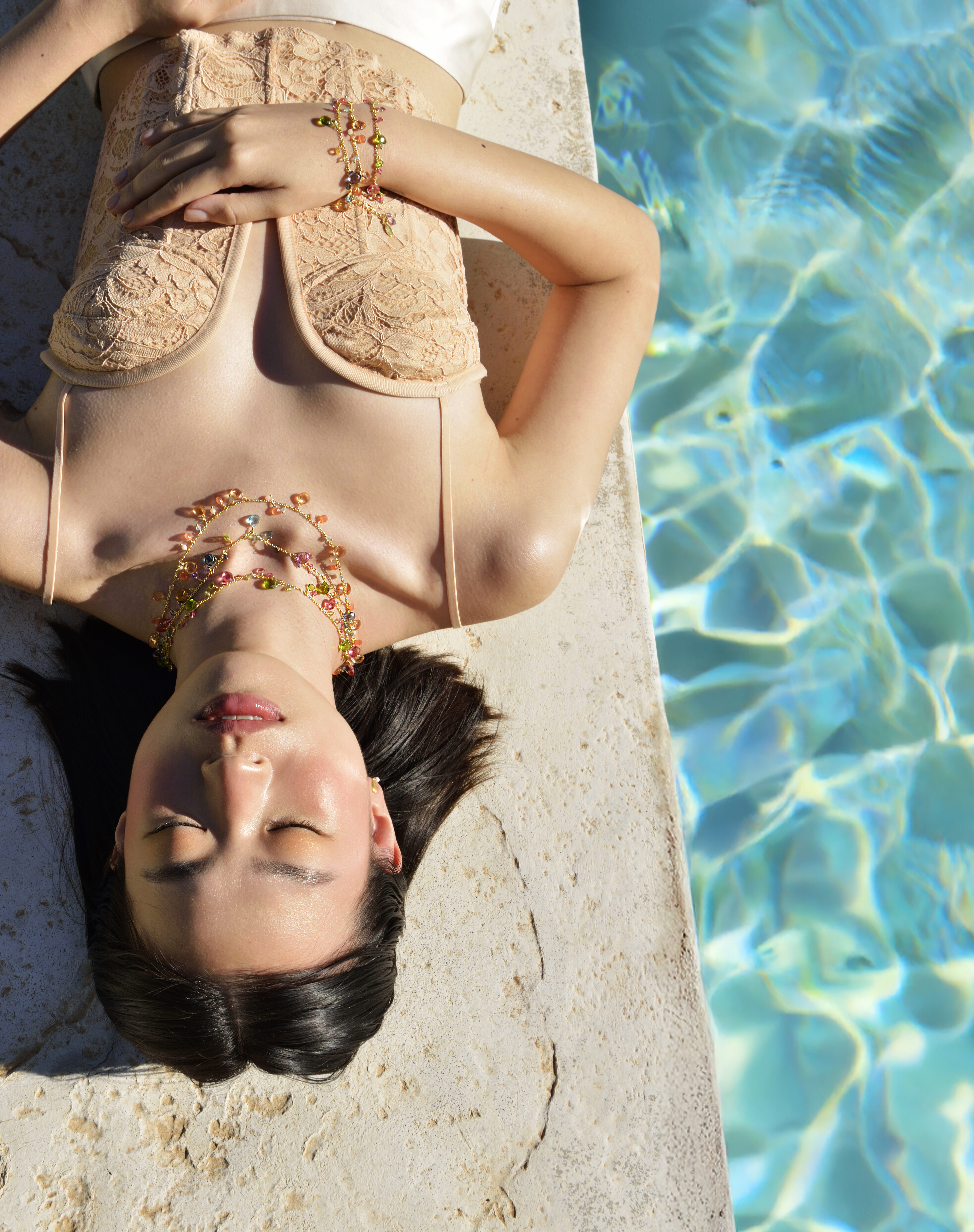 Ed è qui che entrano i gioielli di Salvatore Plata: selezionati con cura per completare ogni linea di Crush, valorizzando la palette cromatica e i volumi della collezione. Pezzi delle linee Organic — con i loro aranci e pesche pieni di freschezza —, Petra, la protagonista della stagione, Palmyra in madreperla, ed Electra con la geometria moderna, agiscono come un contrappunto che accompagna il movimento, illumina i look e rafforza la narrativa visiva della passerella. La gioielleria smette di essere un accessorio: diventa parte integrante della storia di ogni capo, amplificando l’emozione del momento Crush.