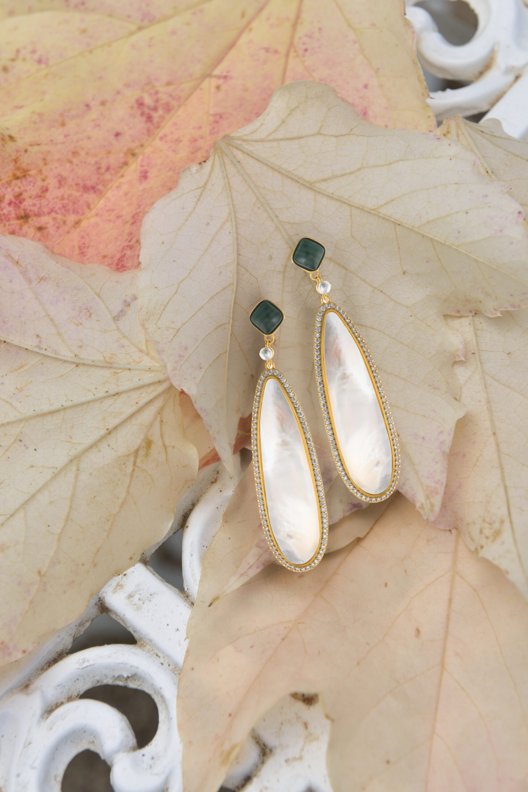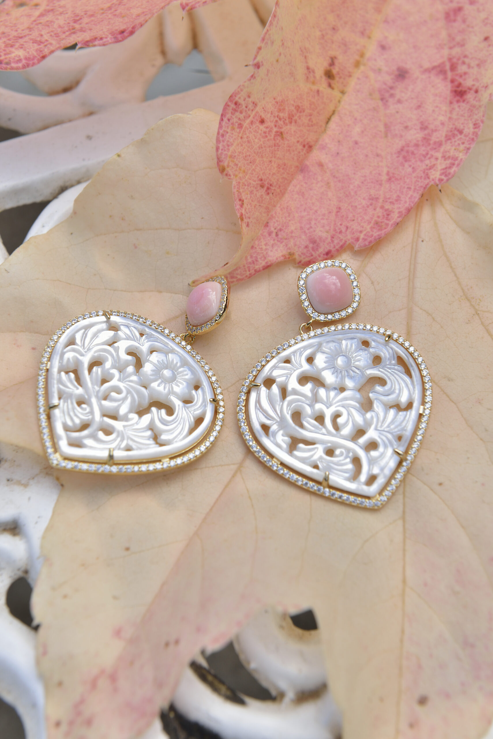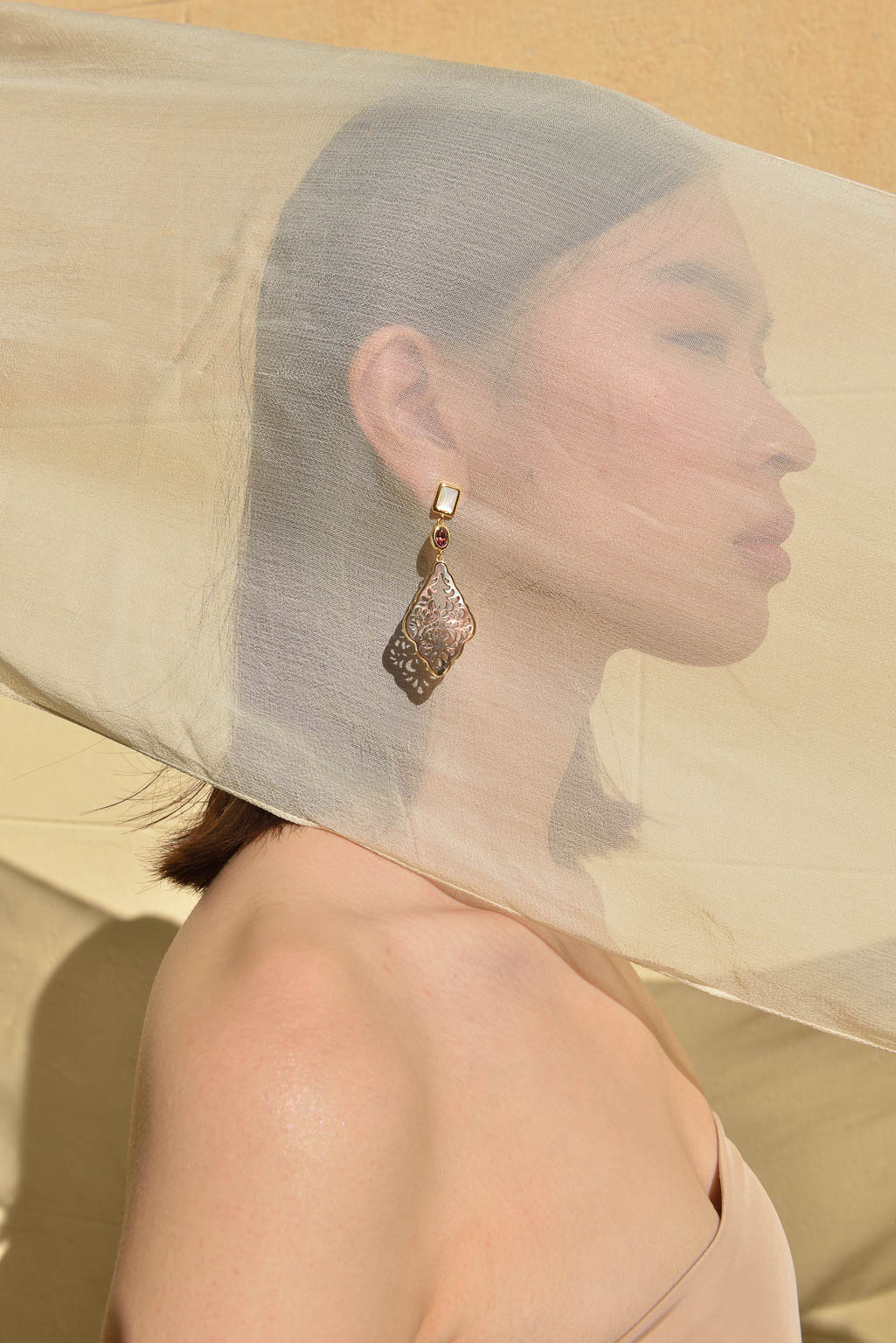 Gli orecchini in argento con madreperla intagliata in delicate filigrane di Palmyra offrono un’estetica in dialogo con l’artigianalità e il movimento di Crush. La madreperla, con i suoi riflessi iridescenti e il tatto organico, agisce come ponte tra naturale e sofisticato, sottolineando l’eleganza discreta e l’impegno artigianale che caratterizzano entrambi i marchi.Electra: geometria moderna ed eleganza strutturata