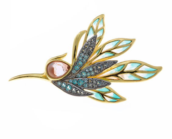 Ninfa es una oda al esplendor de la flora y la fauna del sudeste asiático. Sus broches, verdaderos objetos de colección, representan aves del paraíso, plumas esmaltadas y flores en colores vivos, con circonitas minuciosamente engastadas que recrean la riqueza de los antiguos textiles orientales. Una colección exuberante, creativa y con alma salvaje.