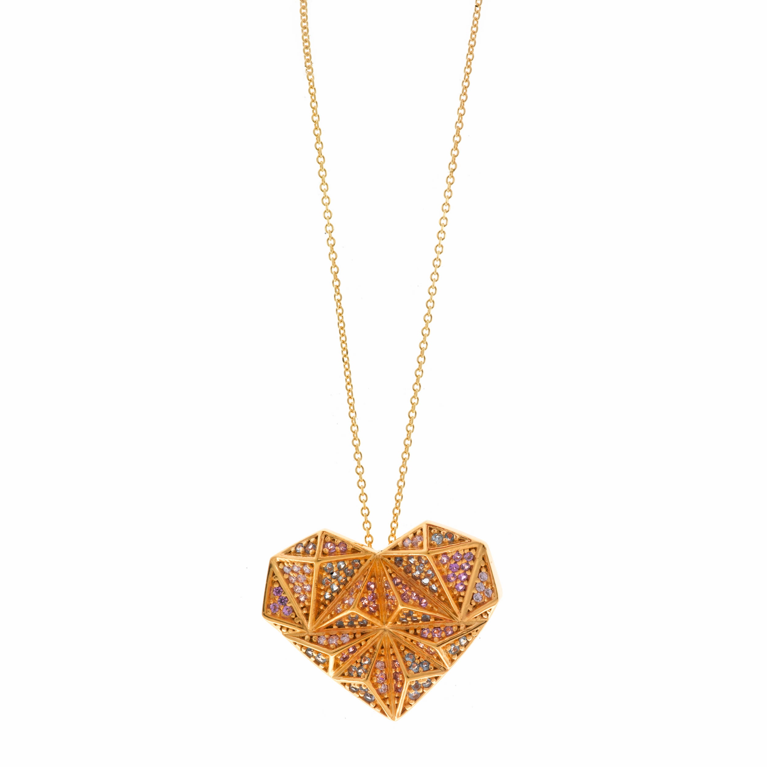 Este gran colgante en forma de corazón facetado, con circonitas de múltiples colores y acabado dorado, es una pieza de impacto. Acompañado de sus anillos a juego, forma un conjunto que celebra el amor con exuberancia y fuerza. Es ideal para quienes buscan un regalo lleno de intención y estilo.